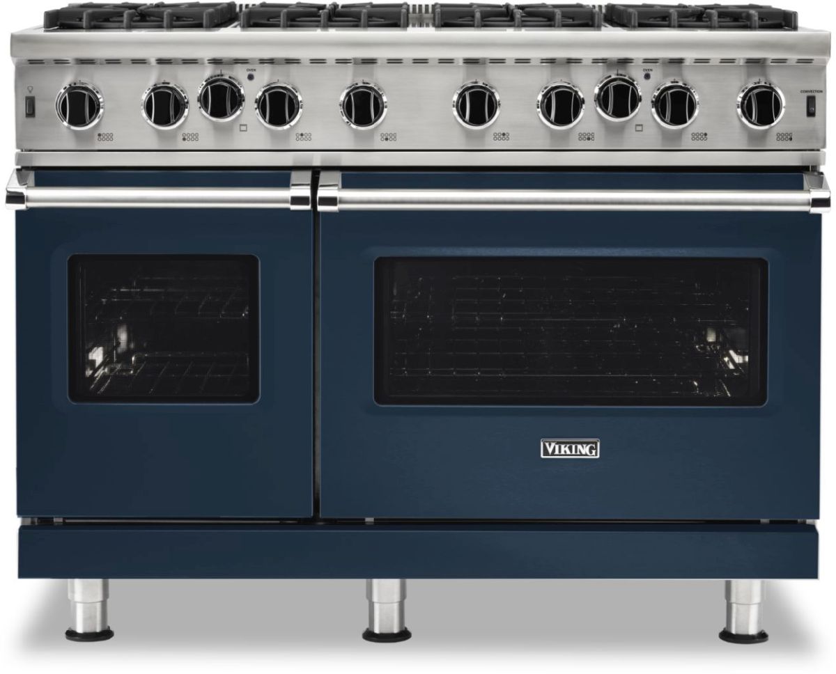 Viking® 5 Series 48" Slate Blue Freestanding Gas Range features a VariSimmer™ Setting, Commercial Type Stainless Steel Open Burners, a SureSpark™ Ignition System, a Gourmet-Glo™ Gas Infrared Broiler, and ProFlow™ Convection Baffle.Read More