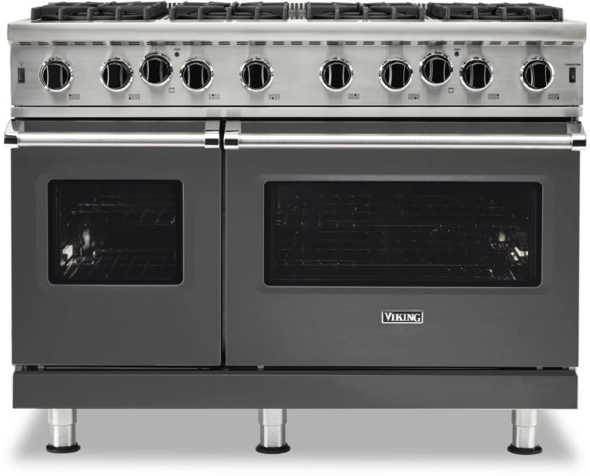 Viking® 5 Series 48" Damascus Gray Freestanding Gas Range features a VariSimmer™ Setting, Commercial Type Stainless Steel Open Burners, a SureSpark™ Ignition System, a Gourmet-Glo™ Gas Infrared Broiler, and ProFlow™ Convection Baffle.Read More